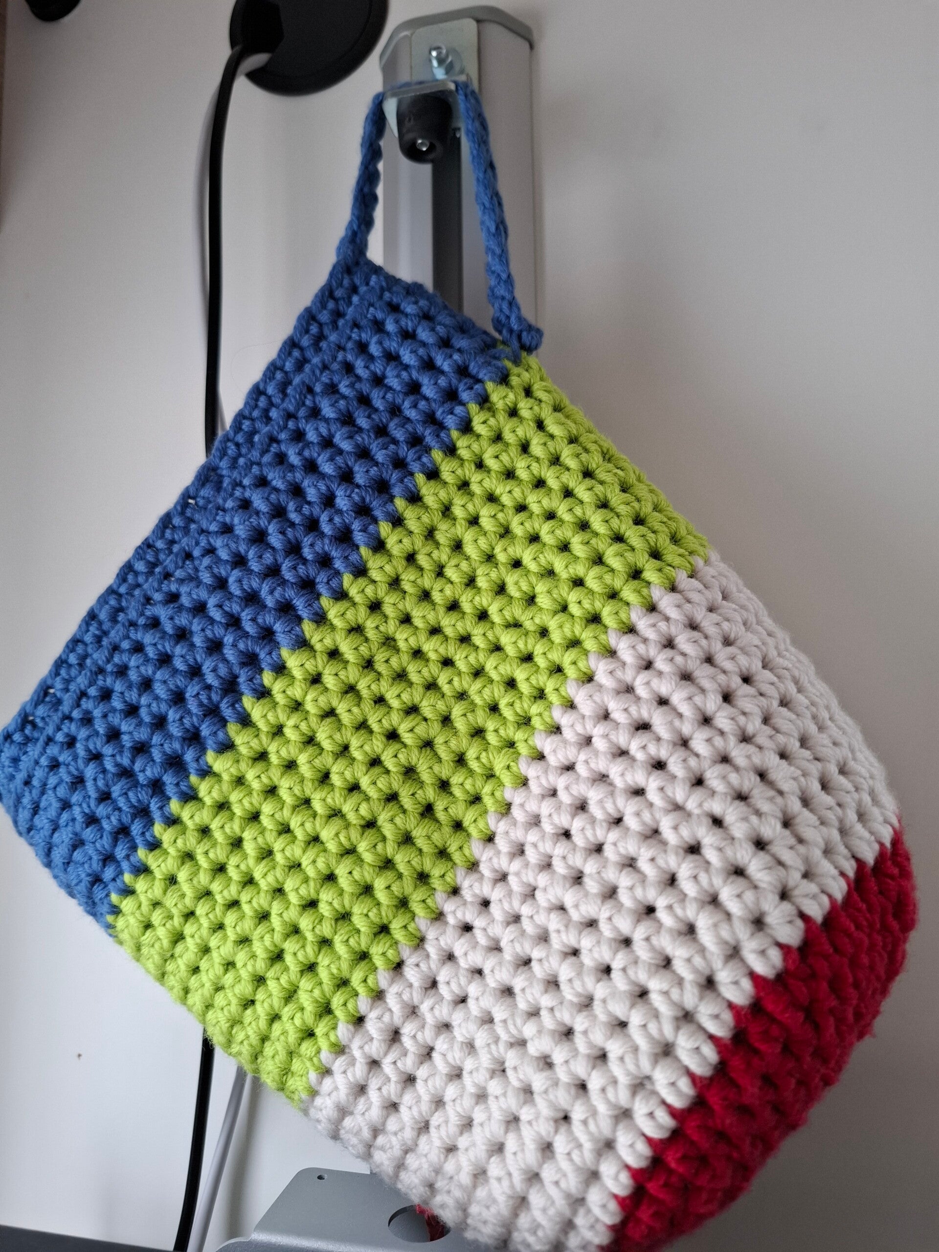 Camper Hängekorb gehäkelt - Einzelstück in bunter Farbe; kann mit gehäkeltem Aufhänger befestigt werden; Farben blau, grün, weiß und rot